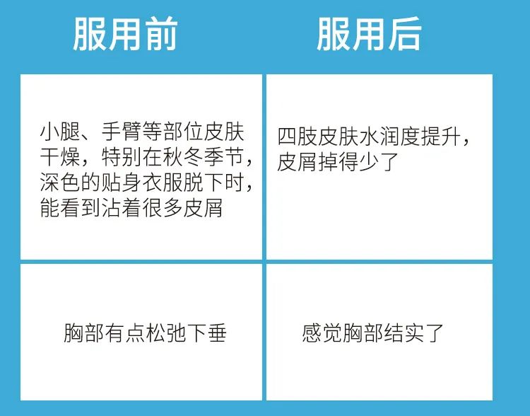 當然這(zhè)裡(lǐ)要(yào)強調的(de)是(shì),口服膠原蛋白(bái)肽時(shí)λ間(jiān)長(cháng)短(duǎn)不(bù)同,效果也(yě)不(bù)同。要(yào)想取得(de)理(lǐ)想效果,一(yī)÷定要(yào)堅持使用(yòng)!